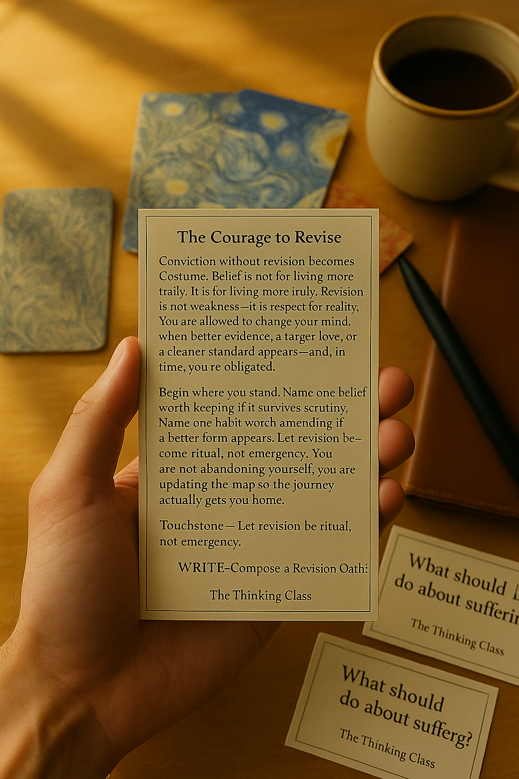 Each month you receive a quiet envelope with 8 Reflection Cards and 4 Thinking Cards. The Reflection Cards pair short essays, questions, and Stoic passages with classic art; the Thinking Cards are deep-question conversation starters you can use with others or on your own.